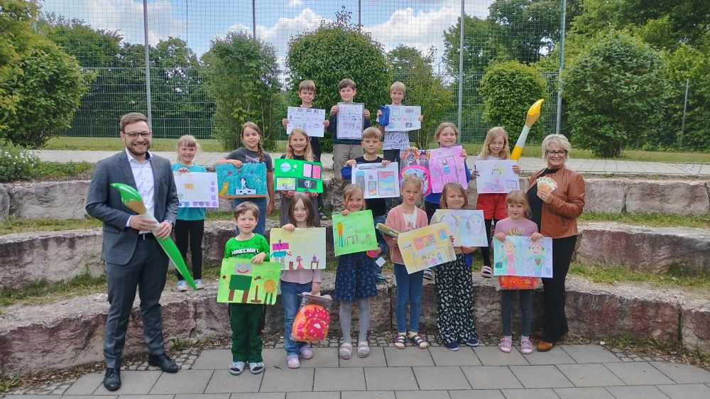 Erwachsene von links: Michael Neumann, Schulleiterin Gisela Leitsch