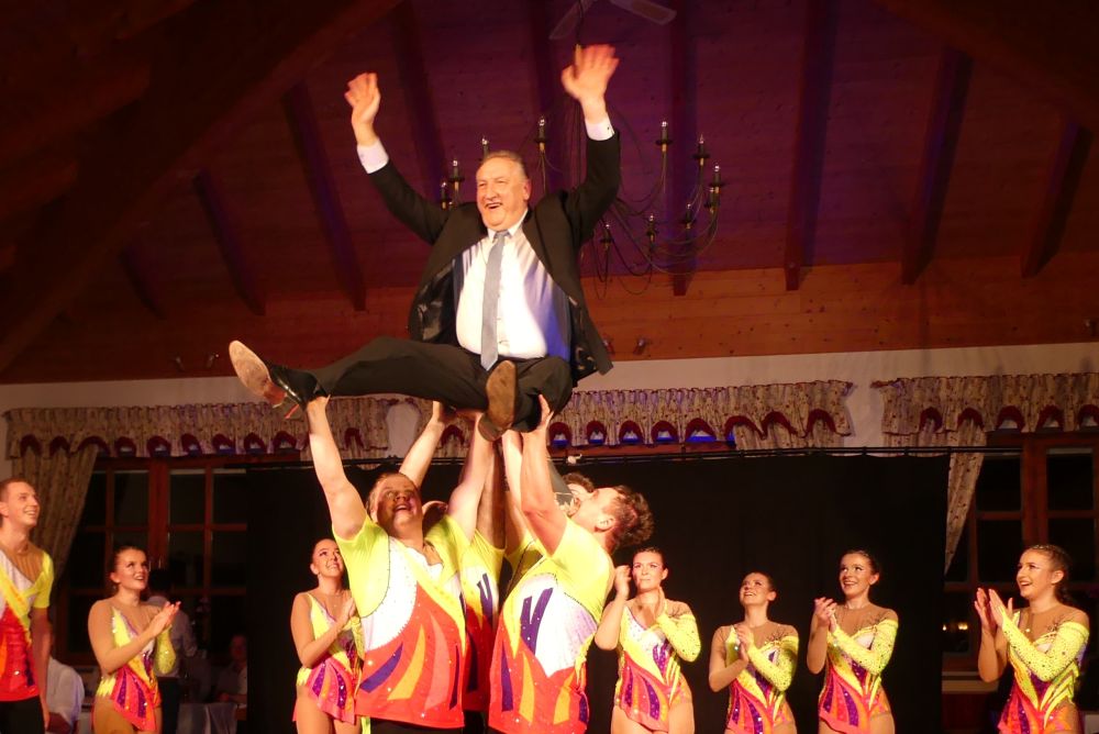 Beeindruckend war aber ganz besonders die waghalsige Hebefigur mit Bürgermeister Hans Wiesmaier, der seine akrobatische Einlage genoss und ganz souverän mit einem Lächeln im Gesicht über sich ergehen ließ.