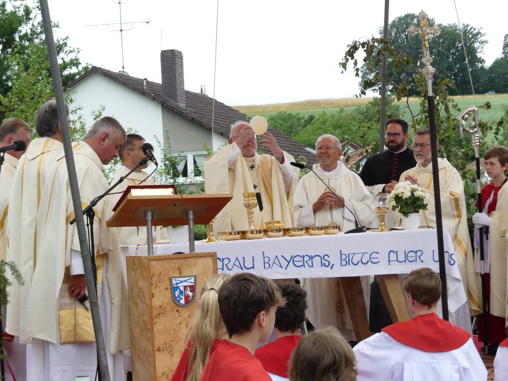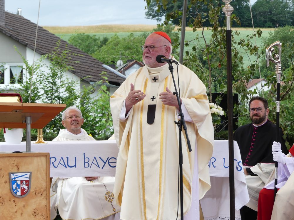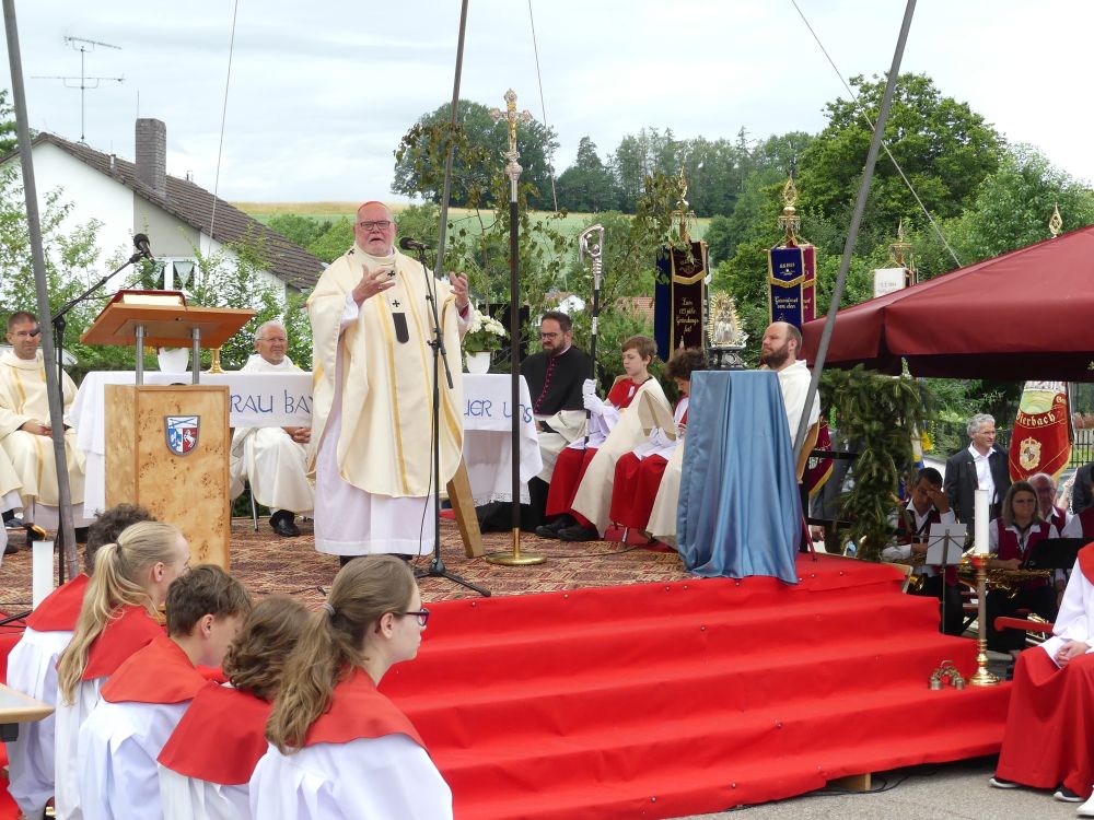 In seiner Predigt nahm der Kardinal Bezug auf das Evangelium von der Hochzeit zu Kana (Joh 2,1–12). Schon hier zeigte sich die Mutter Gottes als Patronin, Fürsprecherin und Wegbegleitung, indem sie Jesus dazu aufforderte, der Hochzeitsgesellschaft aus einer Notlage zu helfen und für den notwendigen Wein zu sorgen. Wir wünschen uns in diesen Krisenzeiten, die geprägt durch Kriege und Vertreibung eine quasi „Zeitenwende“ darstellen, auch die Fürsprache Mariens bei ihrem Sohn, resümierte er und schlussfolgerte: „Deshalb gehen wir auch hierher nach Maria Thalheim um ihre Hilfe zu erbitten“.