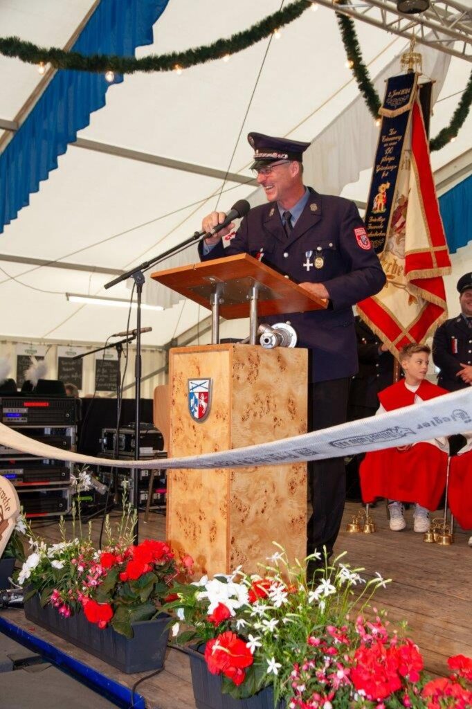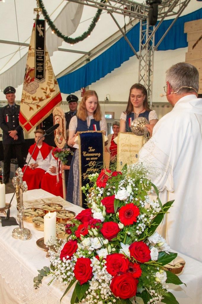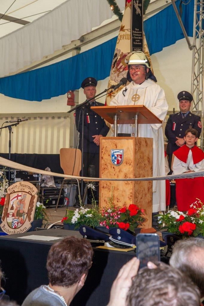 Der Festgottesdienst wurde von Diakon Christian Pastötter zelebriert. In seiner Predigt dankte er den Feuerwehrleuten für Ihren aufopfernden und oft gefährlichen Einsatz und nahm Bezug auf die aktuellen Hochwasserereignisse, bei denen bereits ein Feuerwehrmann ums Leben gekommen ist und ein weiterer vermisst wird. „Gott schütze unsere Feuerwehr!“, rief er den Anwesenden zu und dankte ihnen für ihre Bereitschaft anderen Menschen in Zeiten der Not beizustehen.