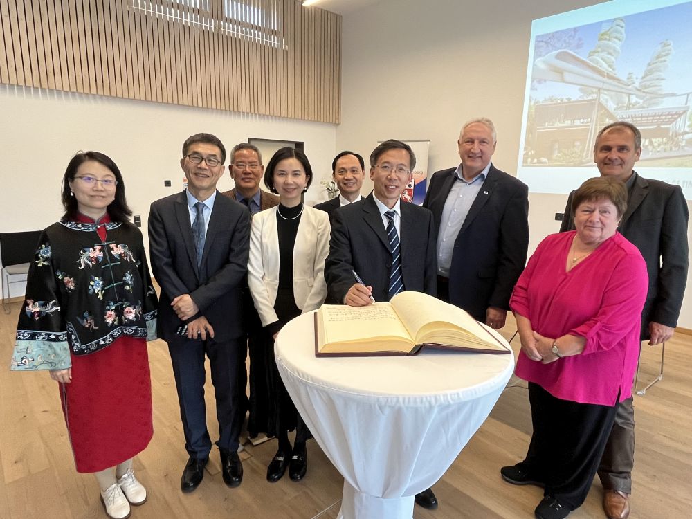 Die chinesischen Gäste tragen sich in das Goldene Buch der Gemeinde Fraunberg ein.