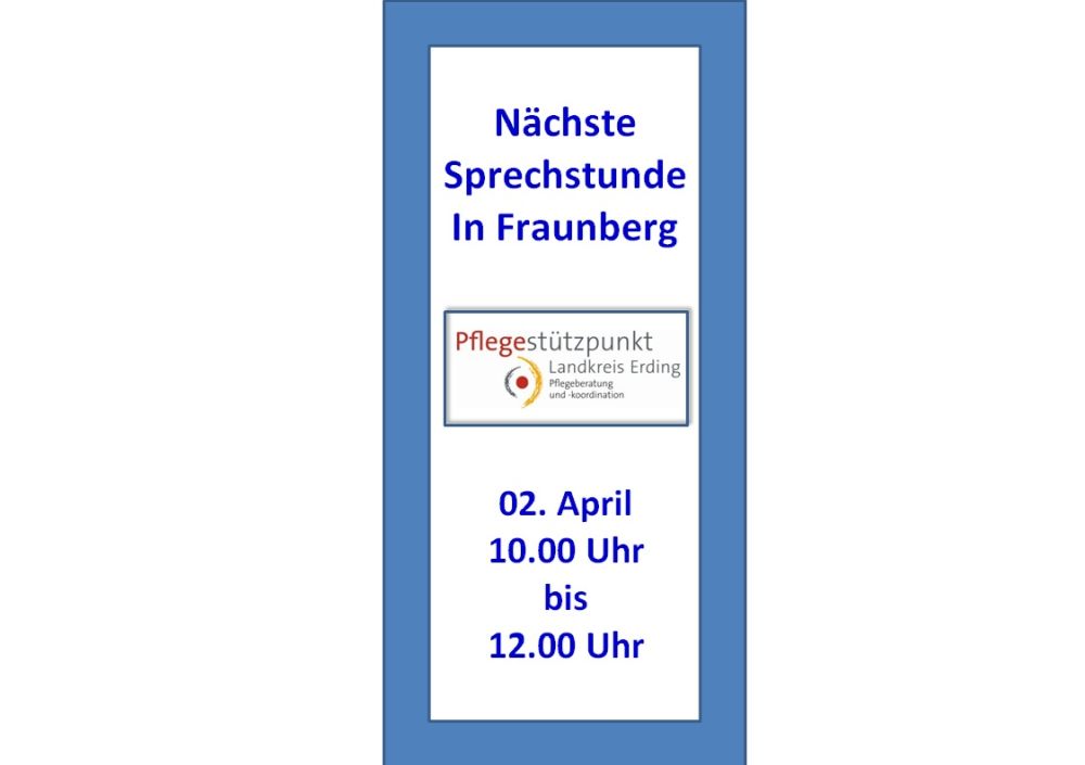 Die Außensprechstunde findet jeden 1. Donnerstag im Monat von 10.00 Uhr bis 12.00 Uhr im Rathaus Fraunberg, Rathausplatz 1, 85447 Fraunberg statt.