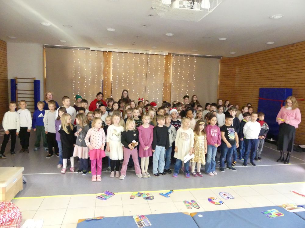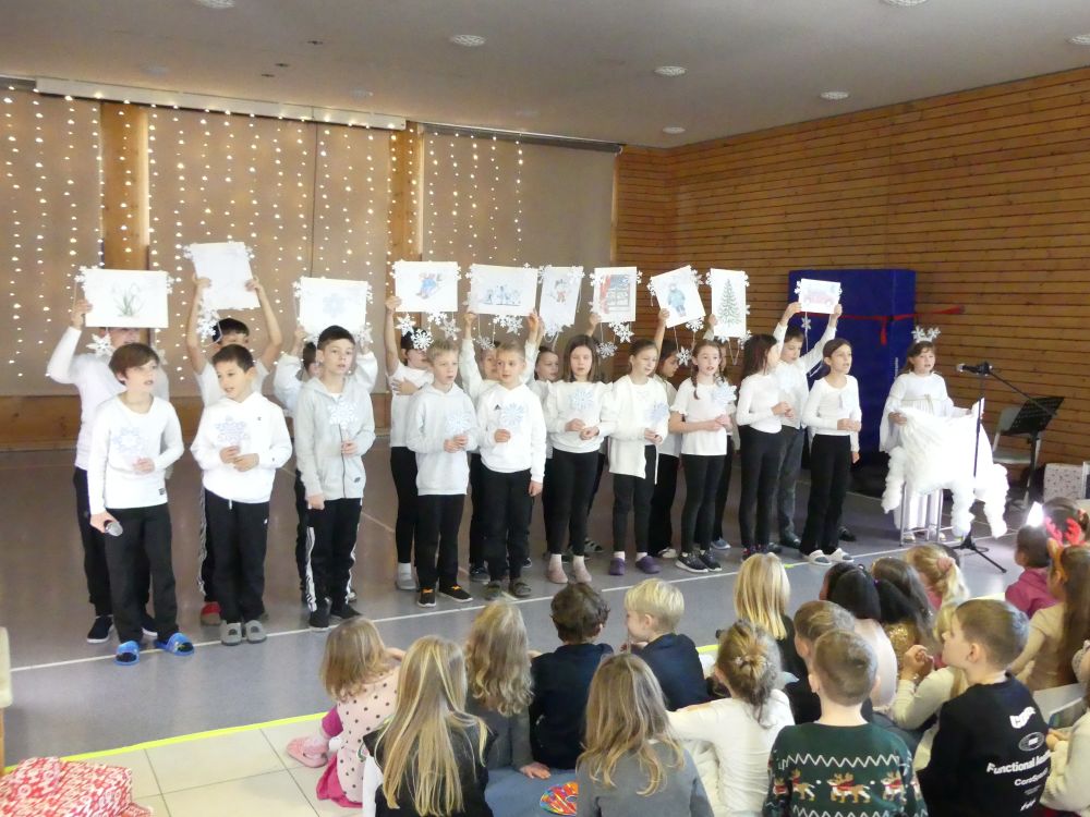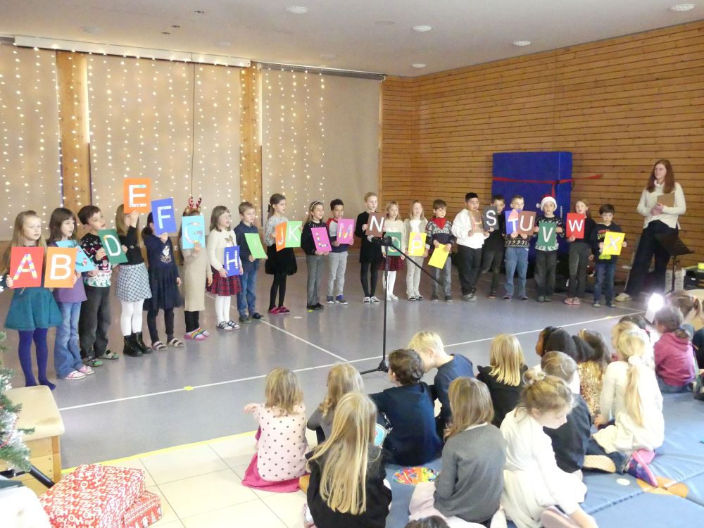 Es wurden Geschichten und Gedichte vorgetragen und zum Schluss überraschte die 4a noch mit einem „Internationalen Weihnachtsquiz“, bei dem es Stoffbären und Süßigkeiten für die Kinder zu gewinnen gab.