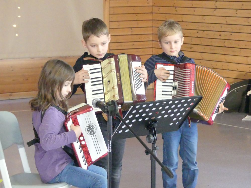 Schließlich zeigten die Kinder ihr Können. Sie hatte schon im Vorfeld ihre Auftritte eingeübt. Trotz vieler Erkrankungen am heutigen Tag konnte so improvisiert werden, dass das Publikum den Ausfall nicht bemerkte. Es war eine Freude zu sehen und zu hören, welchen Entwicklungsstand unsere Jüngsten auf musikalischem Gebiet schon erreicht haben. Ein Potpourri an Instrumenten, vom Klavier über Akkordeon und Gitarre bis hin zum Tenorhorn kamen zum Erklingen.